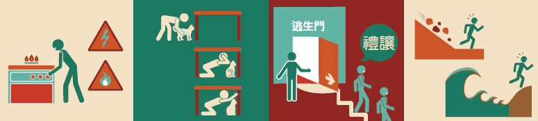 - 高樓住戶逃生時切勿爭先恐後,以免跌倒踩踏,並避免出口擁塞。