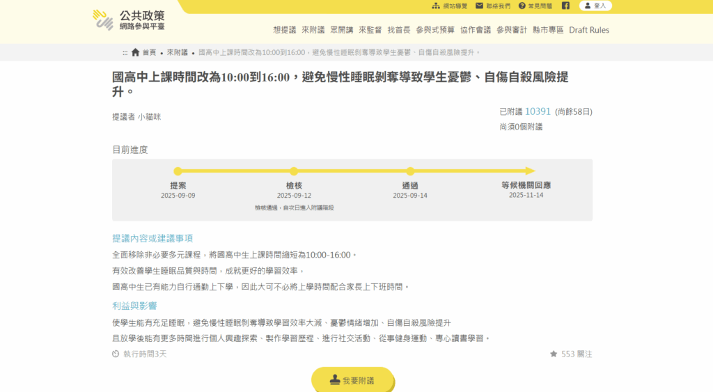 一則「國高中上課時間延後至上午 10 時到下午 4 時」的公共政策連署提案,近日在「公共政策網路參與平台」迅速累積支持,短短不到一週已有逾萬人附議,正式進入政府必須回應的程序。教育部今(15)日表示,該提案涉及地方教育行政權責,將依規定研處,並於 11 月 14 日前提出具體回覆。