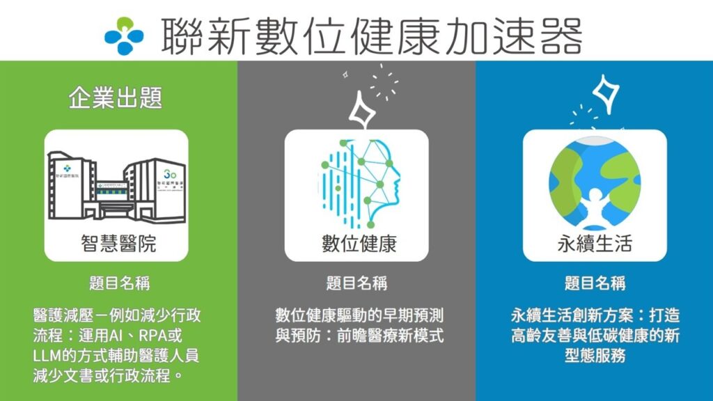 聯新數位健康加速器邀請精誠資訊、舞雲智網等產業夥伴,以實際的醫療與數據痛點作為出題方向,期待透過創意與技術的碰撞,催生下一波可落地的智慧健康解決方案。精誠資訊則以「數位健康驅動的早期預測與預防」為方向,結合其雲端與資料整合優勢,探索健康數據應用於前瞻醫療的新模式;舞雲智網則聚焦「永續生活創新方案」,以IoT與5G邊緣運算技術為基礎,推動高齡友善設計、綠色醫療與低碳健康管理,打造兼具智慧與永續的新型態服務場景;聯新國際醫院以「醫護減壓」為核心,尋求能運用AI、RPA或LLM技術,協助醫護人員減少行政與文書負擔的創新解方,三家出題企業共同構成一個跨域命題矩陣,讓參賽者得以站在產業前線,提出具市場化潛力的創新提案。透過與合作企業提出具體痛點與挑戰題目具落地價值的命題設定,為醫療與健康新創者搭建一條從想法到場域的快速通道。從院內流程優化、臨床AI 輔助、雲端醫療整合,到居家健康監測、物聯網智能生活應用,出題企業不僅直接揭露真實場域痛點,也願意與入選隊伍共同探索解法。因此這不僅是一場競賽,更是一場讓創新者直接對接臨床與市場的加速實驗。