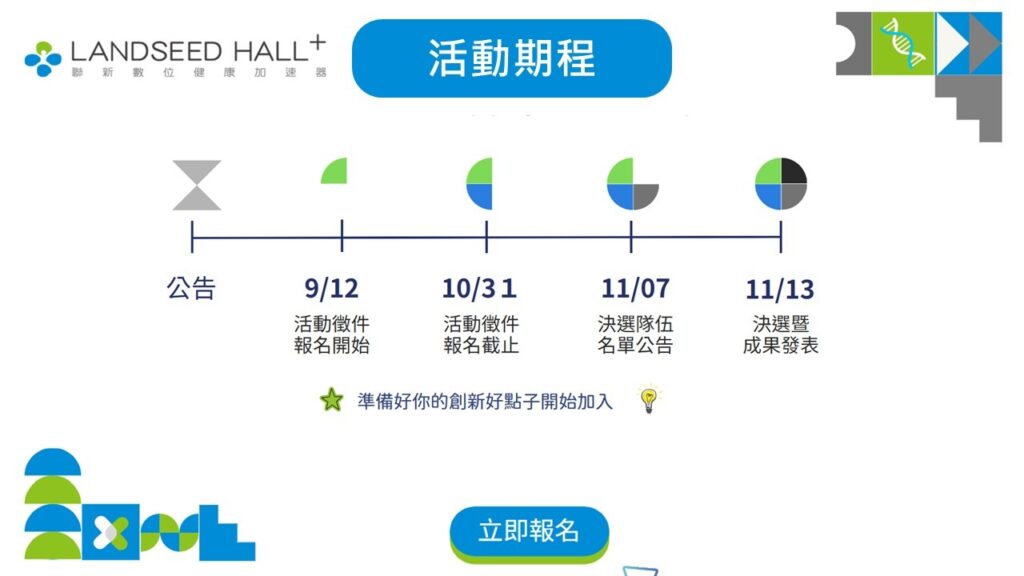 有意參賽者可至競賽官網 https://landseedhallplus.com 查詢詳情與報名方式,或聯絡聯新數位健康加速器Quintus(03-4941234#2046,信箱:service@ibstartup.org)讓創新思維成為驅動健康產業的能量,讓技術與人文在醫療場域中共同發光。2025 聯新國際盃新創好點子競賽,等你以創意改寫健康的未來。